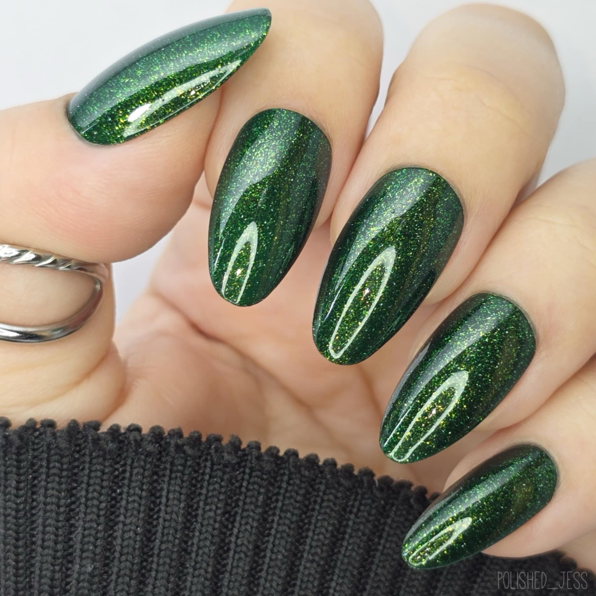 A deep forest green base filled wih glowy green/gold shimmer and a subtle touch of micro holographic flakies.