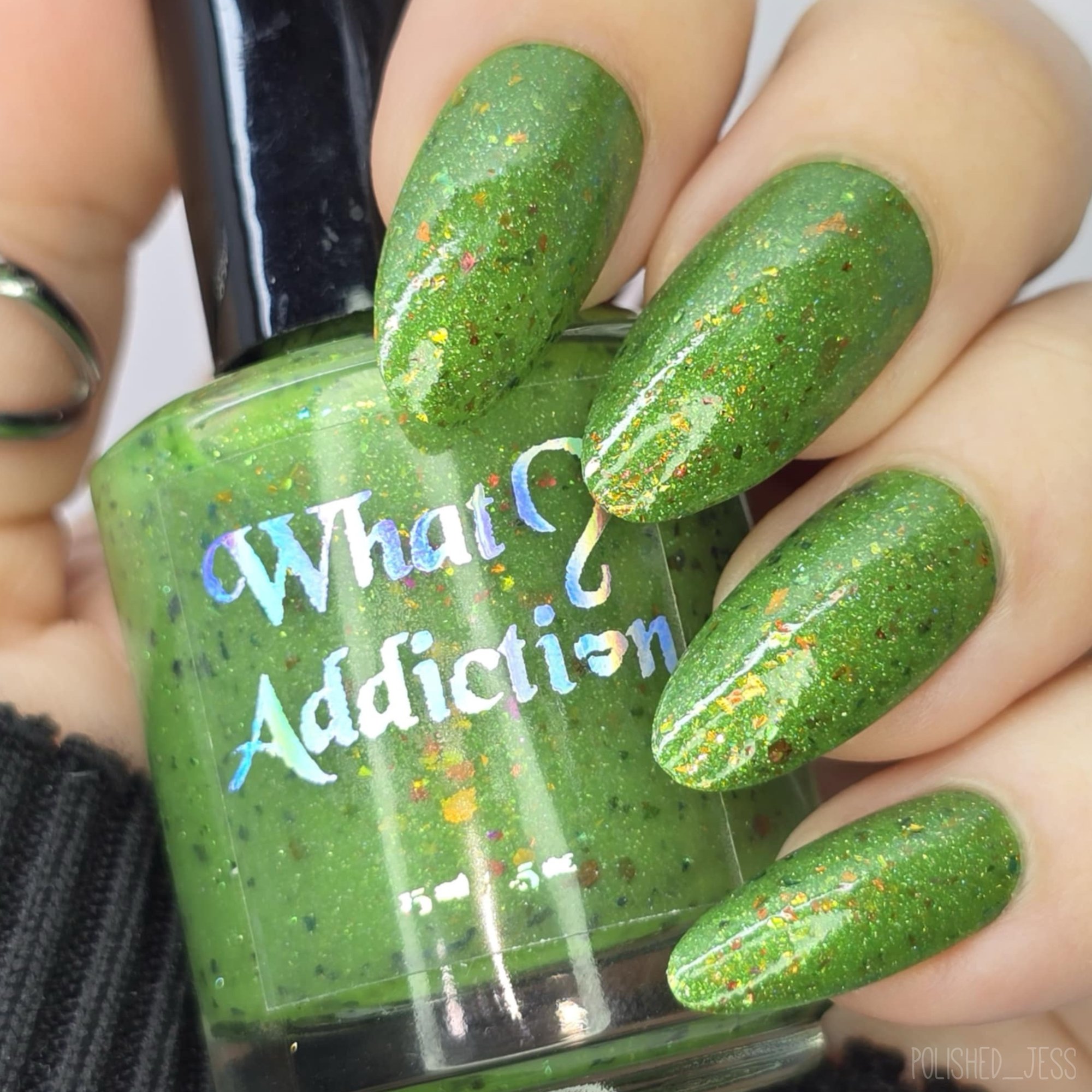 A grass green base, with green gold shimmer, ucc flakes, micro holographic glitters and a touch of micro reflective glitters.
